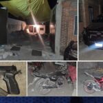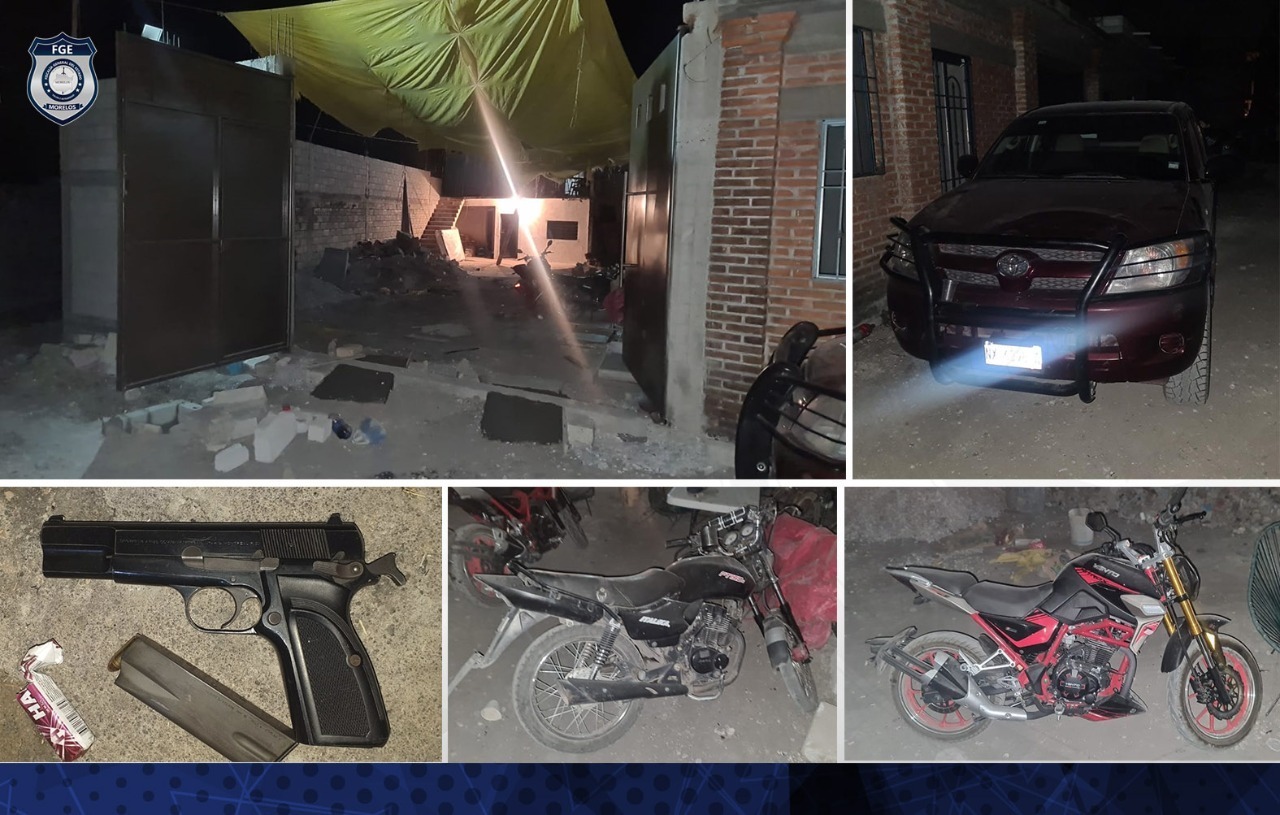 En el lugar se aseguró un arma de fuego marca Colt calibre 38 Súper, dos motocicletas, una camioneta marca Toyota, Hilux, de color guinda con placa de circulación NX-6398-A del estado de Morelos y cuatro aparatos de telefonía celular.