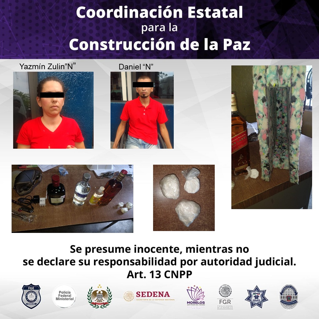 Fue durante una revisión en el área de vistas del CERESO Morelos que se detectó a un hombre, quien dentro de una silla de ruedas escondía 02 botellas de whisky, 01 de vodka, 01 destilado de caña, 01 cuchillo, 02 dos pipas, así mismo al realizar una revisión a la mujer que lo acompañaba de le encontraron entre sus ropas a la altura de su cintura 03 envoltorios con características propias de la cocaína.