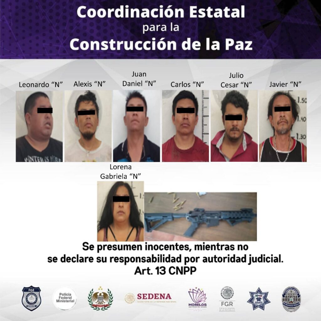 Por ello, fueron detenidos Leonardo “N”, de 41 años de edad; Alexis “N”, de 29 años de edad; Juan Daniel “N”, de 24 años de edad; Carlos “N”, de 32 años de edad; Julio Cesar “N”, de 27 años de edad; Javier “N”, de 39 años de edad; y/a Lorena Gabriela “N”, de 31 años de edad; quienes fueron presentados ante el agente del Ministerio Público correspondiente el cual determinará su situación jurídica.