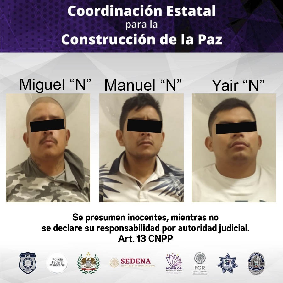 Por ello los elementos de la Policía Morelos les dieron alcance metros adelante, y detuvieron a Miguel Ángel “N”, de 30 años de edad; Manuel Yonatan «N», de 31 años de edad; y Yair «N», de 22 años de edad; quienes fueron presentados ante la Fiscalía Regional de la zona Oriente.