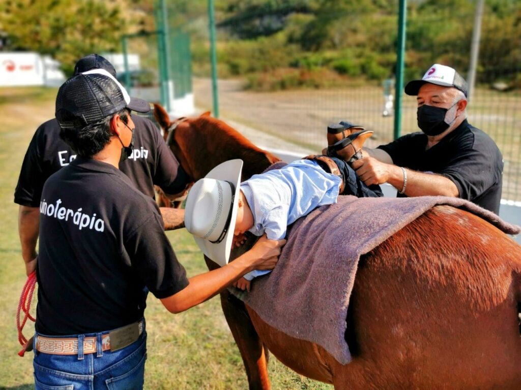 Una sesión de equinoterapia dura un tiempo estimado de 30 a 45 minutos; participan un terapeuta rehabilitador, un guía y dos caballerangos, que cuidan en cada lado al paciente. En promedio se realizan seis sesiones diarias, 30 sesiones semanales y 120 sesiones al mes, con el apoyo de cuatro caballos.