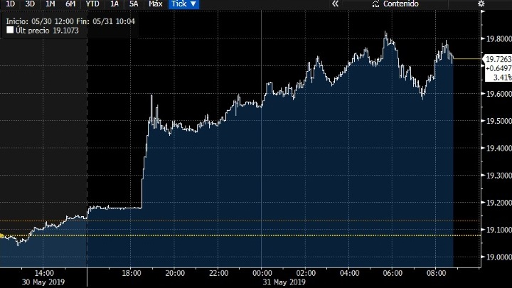 El dólar interbancario opera en 19.74 unidades a las 8:10 de la mañana de este viernes. En el día, el peso pierde 3.1 por ciento, de acuerdo con el cierre de Bloomberg de 19.1425, a las 16:00 horas del jueves.