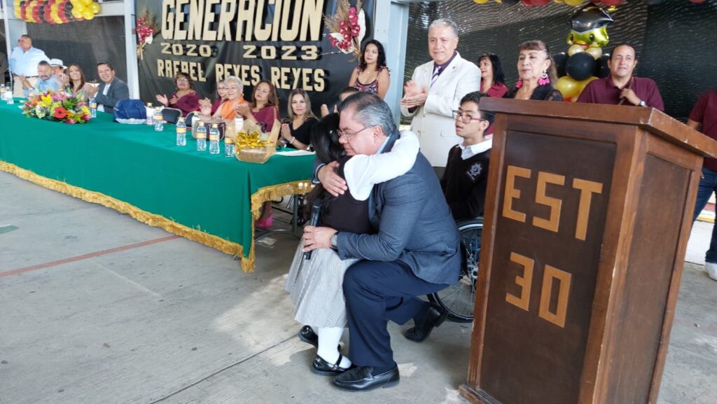 Durante la ceremonia de graduación de los estudiantes de la escuela secundaria técnica 30, ubicada en la colonia Tlahuapan, el edil Rafael Reyes se comprometió a entregar paquetes de útiles escolares para estudiantes del nivel básico (primaria y secundaria) así como material didáctico para preescolares para el ciclo 2023-2024.