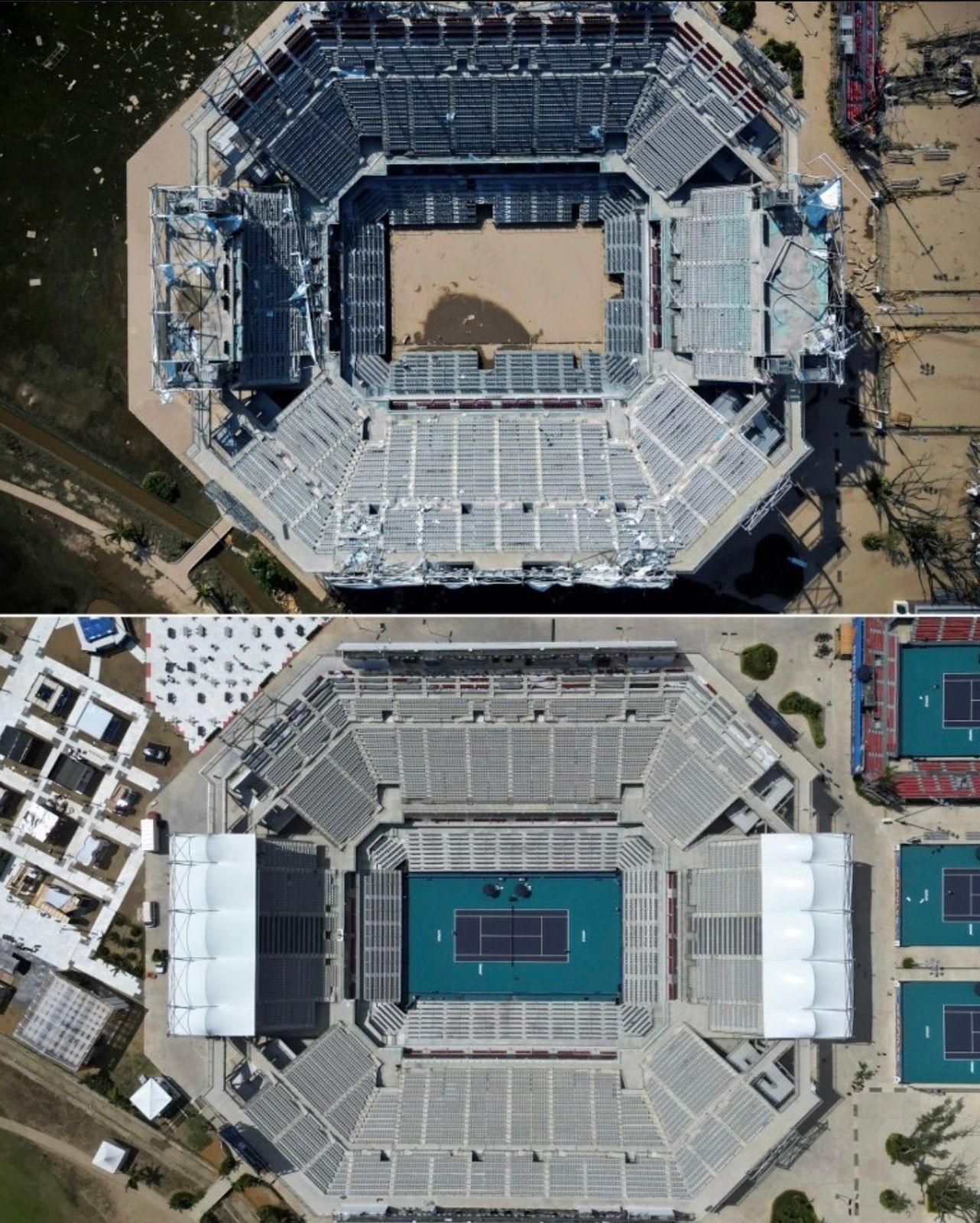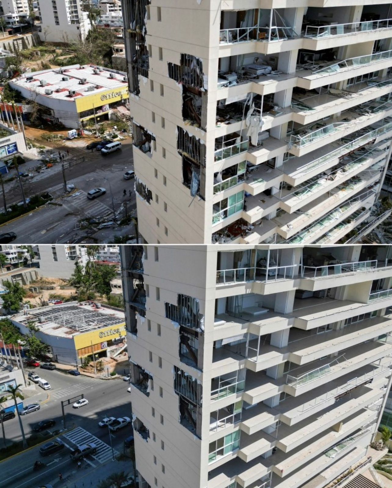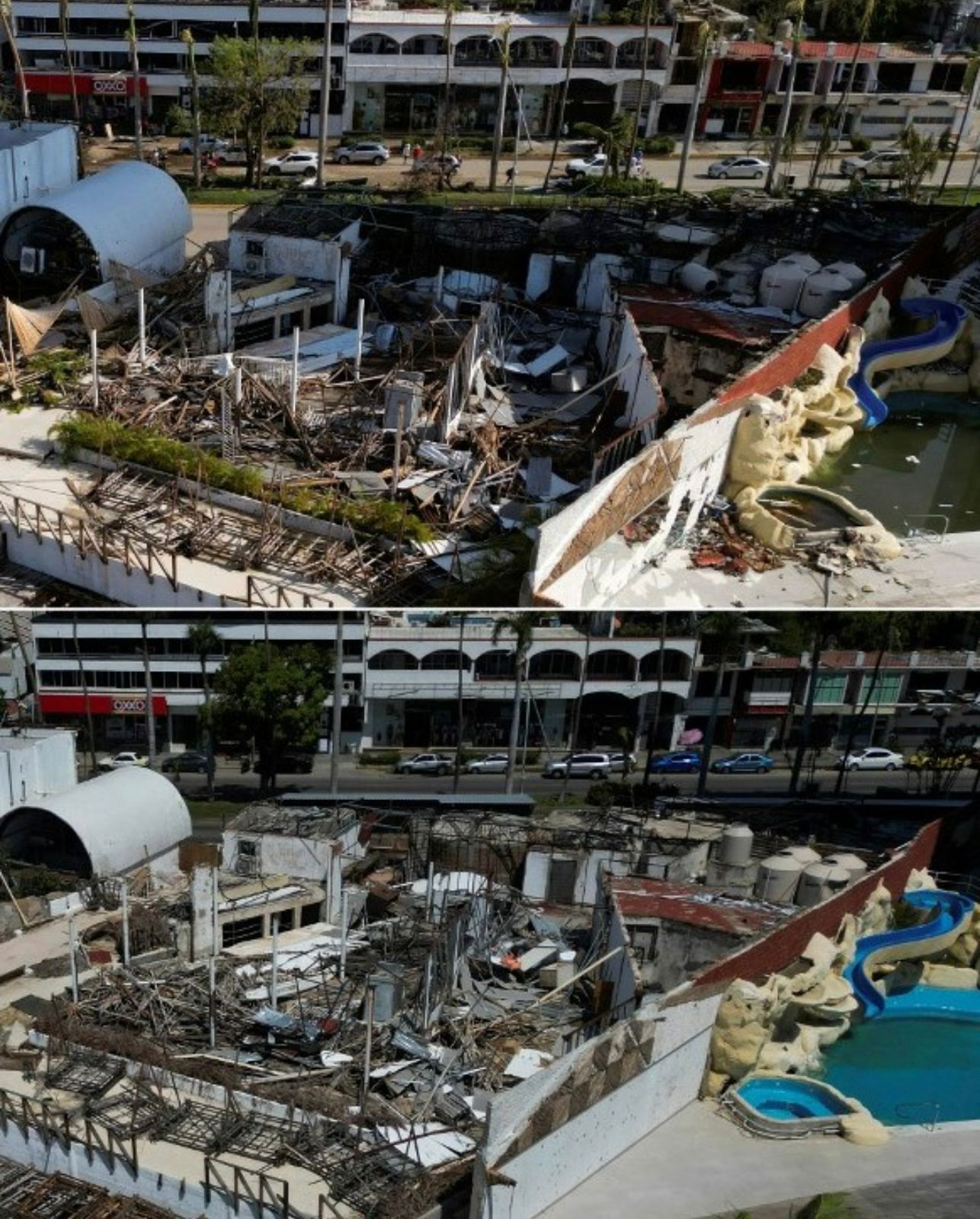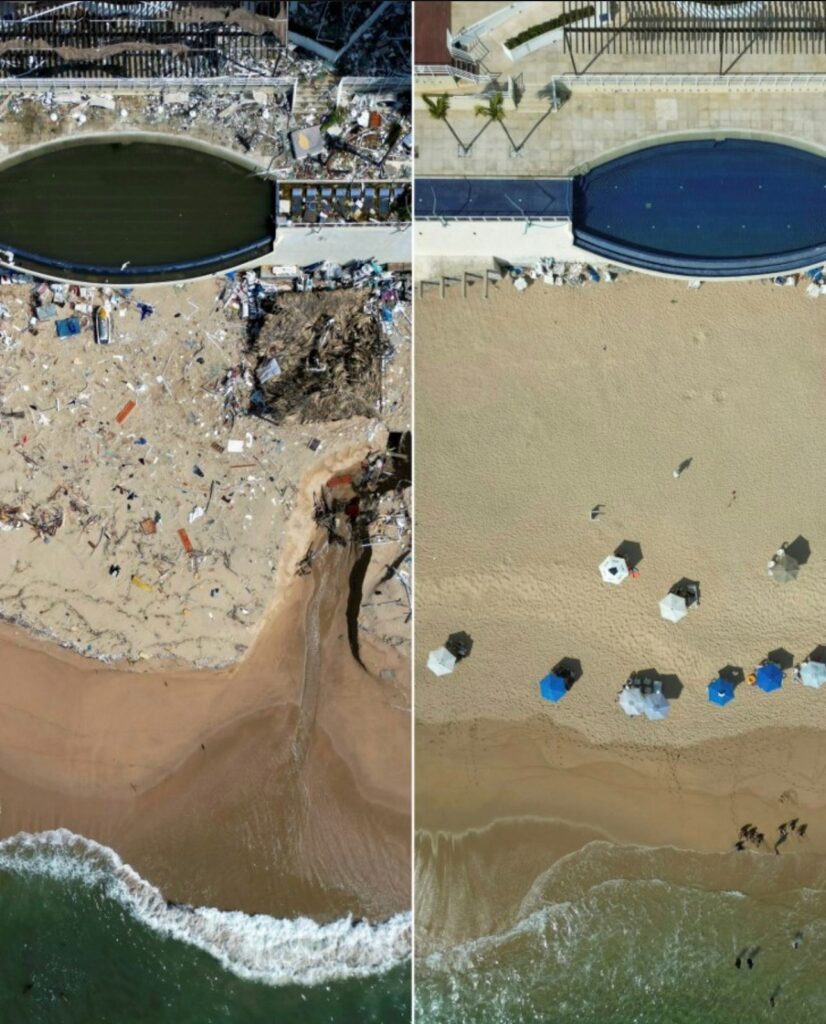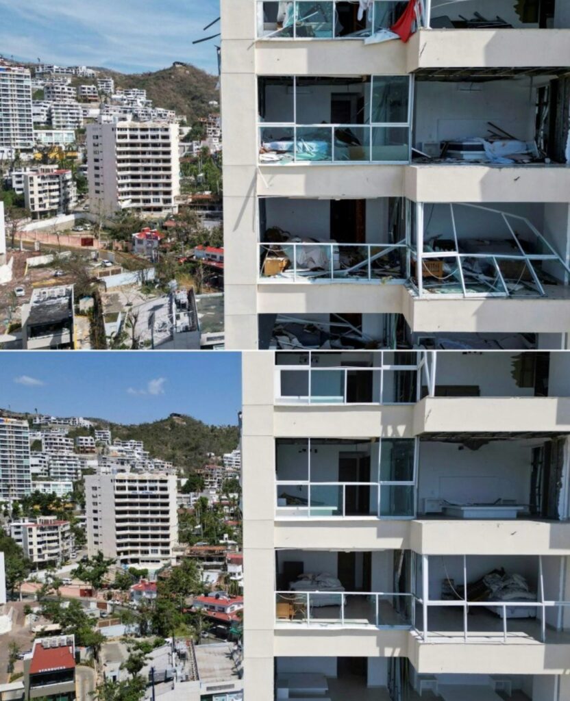 Estas imágenes aéreas ofrecen una comparativa entre el paisaje antes y después del huracán Otis en Acapulco, evidenciando los graves daños causados. Las imágenes muestran un escenario desolador con edificios parcial o completamente destruidos, escombros y devastación.