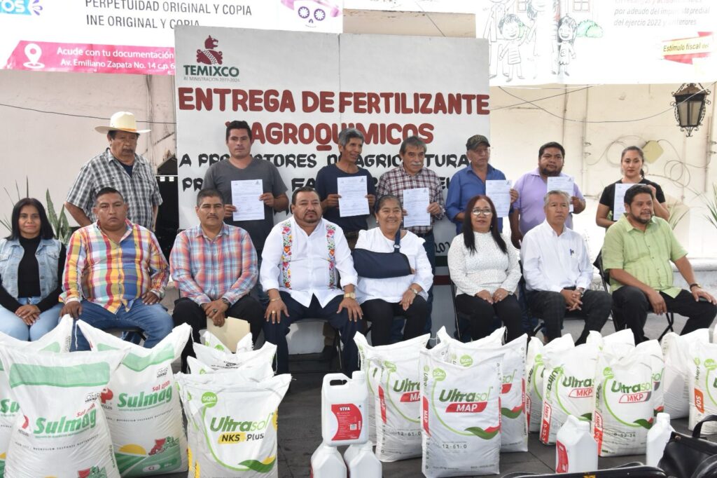 Con el objetivo de sumar calidad a la producción anual y una agricultura protegida en Temixco, la presidenta municipal del Ayuntamiento Juanita Ocampo Domínguez en compañía del síndico municipal Andrés Duque Tinoco, integrantes del cabildo y Gabinete Municipal hicieron entrega de 11 toneladas de fertilizante químico y algunos agroquímicos de acuerdo a las necesidades de los 12 productores beneficiados con un monto de 350 mil pesos como parte del Fondo de Aportaciones para el Desarrollo Económico de los Municipios (FAEDE) 2023.
