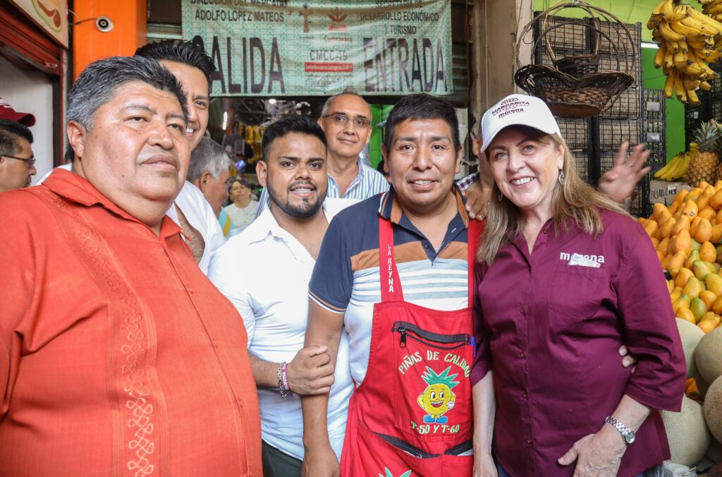 Margarita González Saravia, candidata a la gubernatura de Morelos por la coalición Sigamos Haciendo Historia, acudió a recorrer el mercado Adolfo López Mateos en una invitación de la unión de comerciantes, líderes y locatarios, quienes le compartieron las necesidades que requieren para impulsar su funcionamiento, así como obras que están inconclusas.