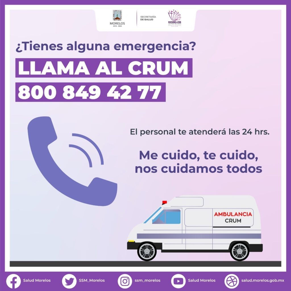Finalmente, compartió que en caso de emergencias pueden llamar al 9-1-1 o al Centro Regulador de Urgencias Médicas (CRUM), 800 849 42 77, las 24 horas del día.