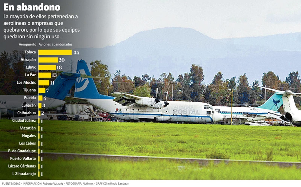 El aeropuerto de Toluca es el que tiene mayor número de aparatos sin operación, con 34, todos son equipos privados; seguido del Aeropuerto Nacional Jorge Jiménez Cantú, ubicado en Atizapán, con 20 aeronaves abandonadas.