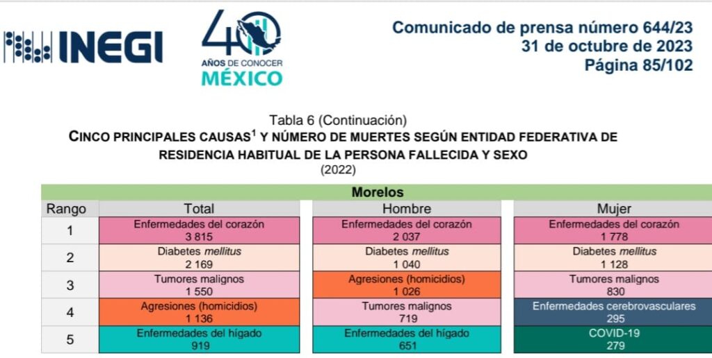 Según cifras del INEGI, en Morelos ocurrieron 15,897 defunciones. La primera causa de muerte por la que murieron los morelenses en 2022 fueron las enfermedades del corazón (3,815), la segunda Diabetes mellitus (2,169), y la tercera tumores malignos (1,550).