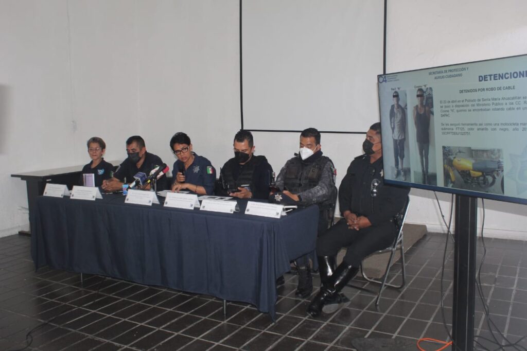 Asimismo, el 20 de abril en el poblado de Santa María Ahuacatitlán detuvieron y pusieron a disposición del Ministerio Público a Raúl “N” y Cosme “N”, quienes se encontraban robando cable de un pozo del Sistema de Agua Potable y Alcantarillado de Cuernavaca (SAPAC); se les aseguró herramienta, así como una motocicleta marca Italika, submarca FT125, color amarillo con negro, año 2018 con número de serie 3SCPFTDE6J1025751.