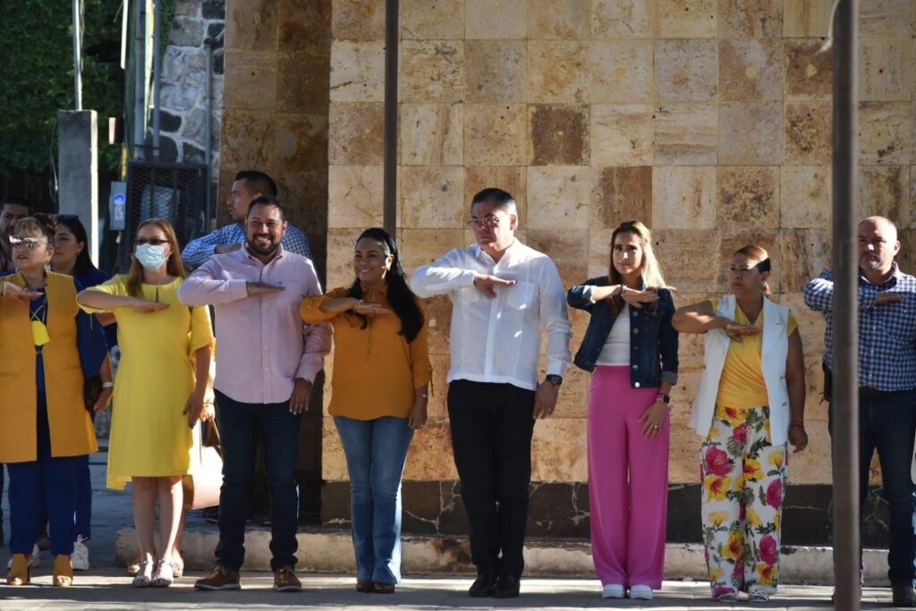 En punto de las 8:00 horas el edil e integrantes del Ayuntamiento (síndica, regidoras y regidores) presenciaron el izamiento a toda asta del lábaro patrio, en señal de festividad por el 217 aniversario del nacimiento de quien fuera Presidente de México e impulsor de las Leyes de Reforma.