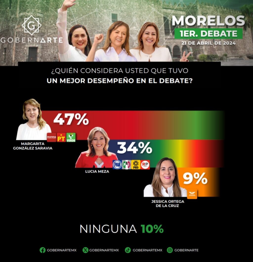 Despues del debate convocado por el Impepac, donde participaron las tres candidatas a la gubernatura del estado de Morelos, cuatro casas encuestadoras arrojaron en sus resultados que la ganadora es la candidata Margarita González Saravia de la coalición Sigamos Haciendo Historia.