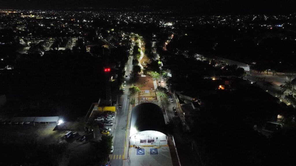 Respecto a los trabajos de alumbrado, se realizó la excavación de cepas, se suministró y colocó 19 postes de nueve metros cada uno, en los cuales se colocaron 38 piezas de lámparas led de 100 watts, esto con la finalidad de dotar de luz artificial al parque, ampliando con ello los horarios de uso del espacio público, asimismo se instalaron reflectores en la cancha de usos múltiples.
