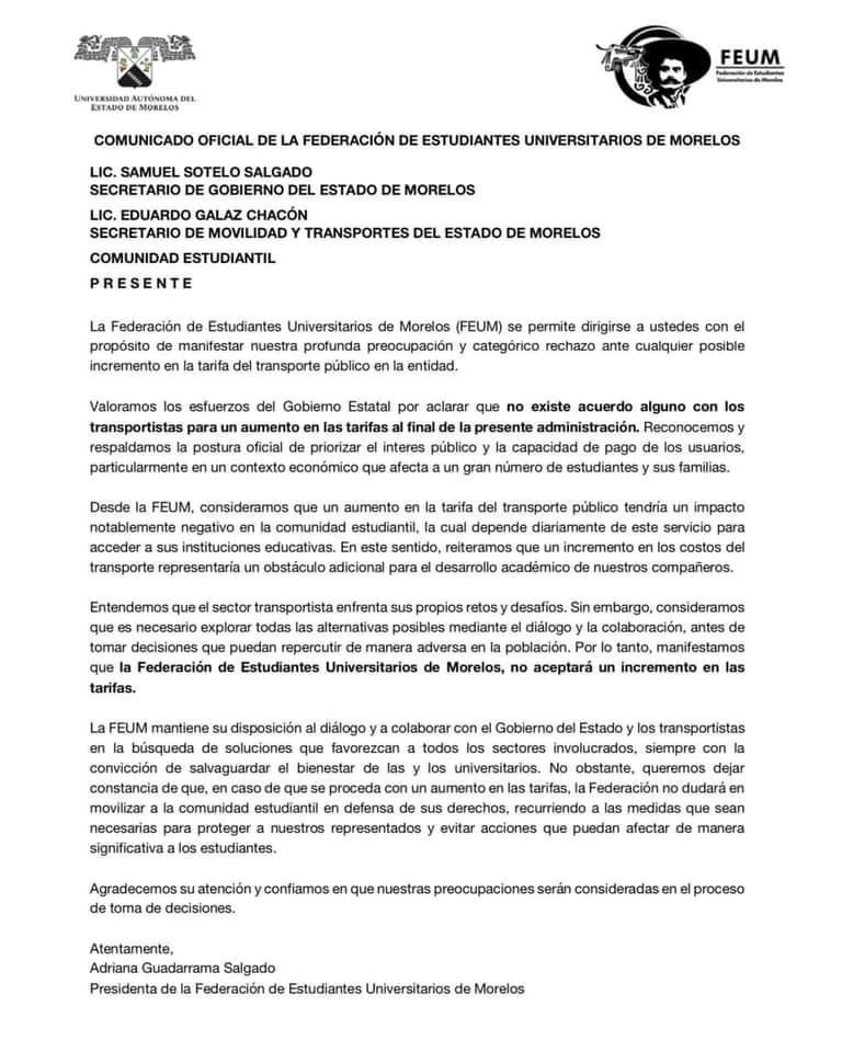 La Federación de Estudiantes Universitarios de Morelos (FEUM) manifestó su rechazo a la propuesta de incrementar en 4 pesos las tarifas del transporte público en la entidad, señalando que dicha medida perjudicaría gravemente a los estudiantes, quienes dependen en gran medida de este servicio para trasladarse a la Universidad Autónoma del Estado de Morelos (UAEM).