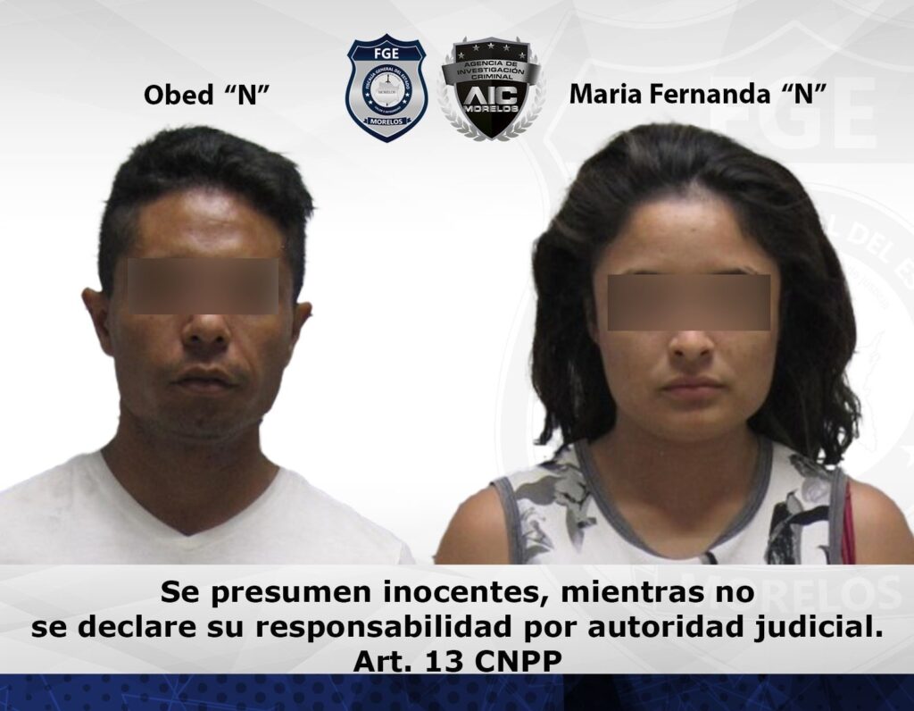Derivado de las investigaciones desarrolladas, se logró establecer la identidad de los responsables, en contra de quienes la Fiscalía de Feminicidios obtuvo una orden de aprehensión cumplimentada en el municipio de Temixco por agentes investigadores comisionados, quienes detuvieron a Obed “N” de 31 años de edad y María Fernanda “N” de 22 años.