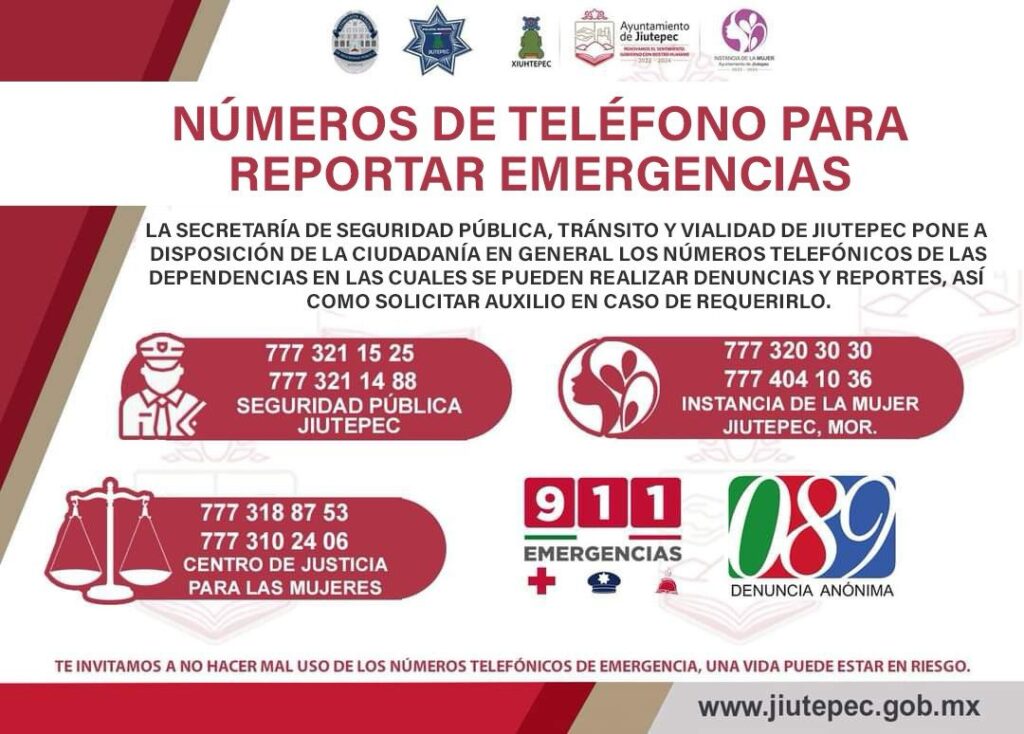 El Gobierno de Jiutepec refrenda su compromiso de trabajar para salvaguardar la integridad y los derechos de las personas, así como preservar las libertades, el orden y la paz públicos. Se invita a la población a reportar las situaciones de emergencia en los números de teléfono 911 y 777-321-15-25.