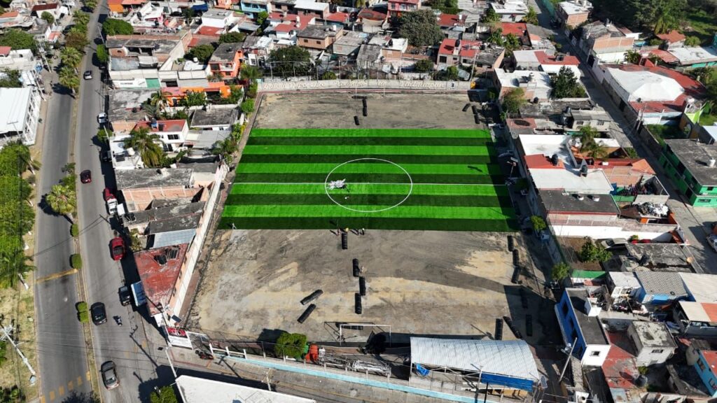 Entre las acciones a realizarse están el desmontaje o retiro de cuatro mil 490 metros cuadrados de pasto, por medios manuales, el suministro e instalación de cuatro mil 490 metros cuadrados de pasto sintético, asimismo la aplicación de arena sílica y caucho.