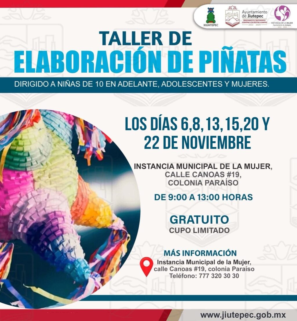 El próximo lunes seis de noviembre continuará el taller de elaboración de piñatas, el cual se imparte de forma gratuita en las instalaciones de la Instancia de la Mujer (calle Canoas #19 colonia Paraíso) y está dirigido para niñas, adolescentes y mujeres.