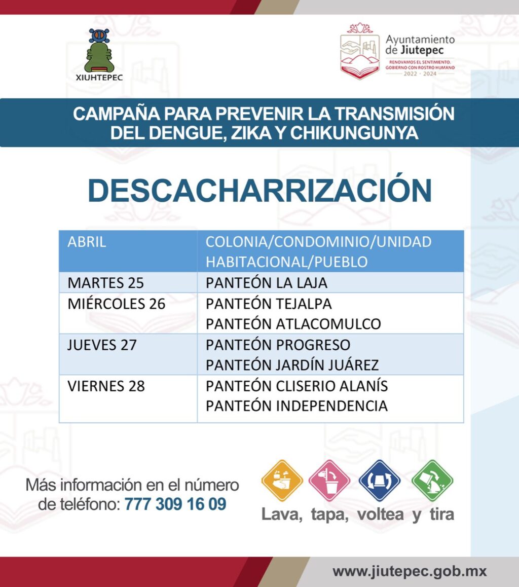 Este martes 25 la descacharrización se realiza en el panteón de la colonia La Laja; el miércoles 26 se llevarán a cabo trabajos en los panteones de los pueblos de Atlacomulco y Tejalpa; el jueves 27 en el pueblo de Progreso y la colonia Jardín Juárez, para concluir el viernes 28 en el panteón del pueblo de Cliserio Alanís y la colonia Independencia.