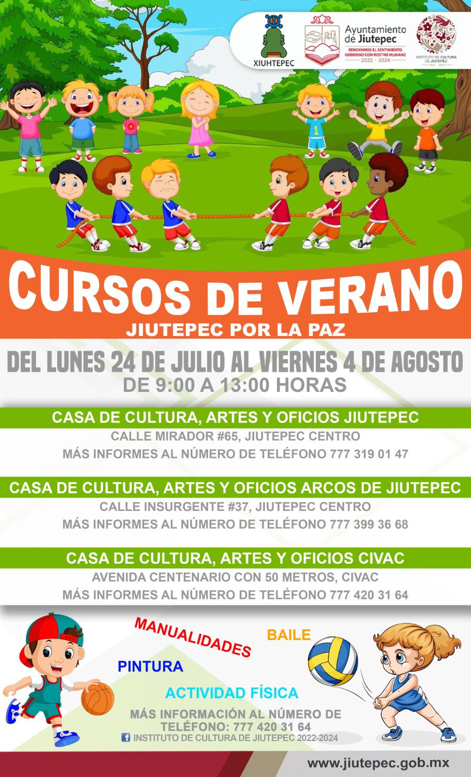 El Gobierno con Rostro Humano, encabezado por el alcalde Rafael Reyes, invita a niñas y a niños del municipio a participar en el curso de verano «Jiutepec por la paz» el cual se impartirá del lunes 24 de julio al viernes 4 de agosto en las Casas de Cultura, Artes y Oficios de las colonias Centro y Civac, así como en la de la unidad habitacional Arcos de Jiutepec.