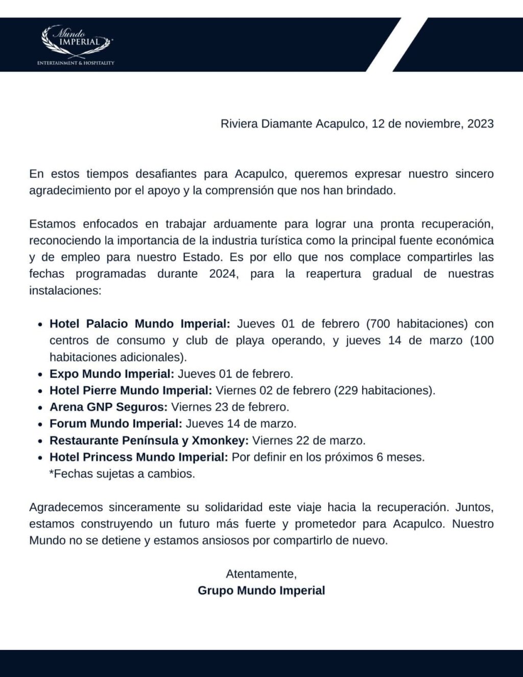 Grupo Mundo Imperial dio a conocer la reapertura gradual de sus hoteles en Acapulco, tras la emergencia por el huracán Otis.