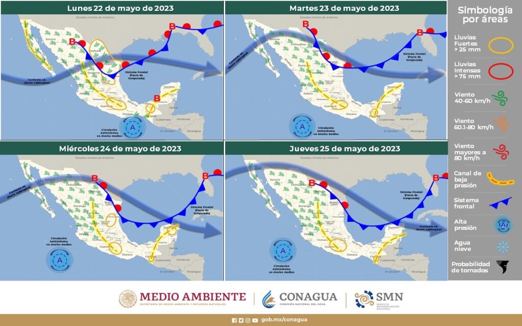 Además, un canal de baja presión y disponibilidad de humedad, principalmente en la región centro-sur de la República Mexicana, favorecerá el desarrollo de nublados y tormentas vespertinas en estados de estas regiones del país.