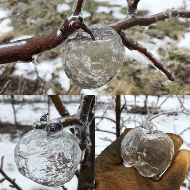 Este fenómeno de la naturaleza ocurre cuando la lluvia helada se deposita en la fruta y la va «quemando». Debido a esto, las manzanas comienzan a descomponerse, dejando atrás su aspecto apetecible y apareciendo el de la imagen.