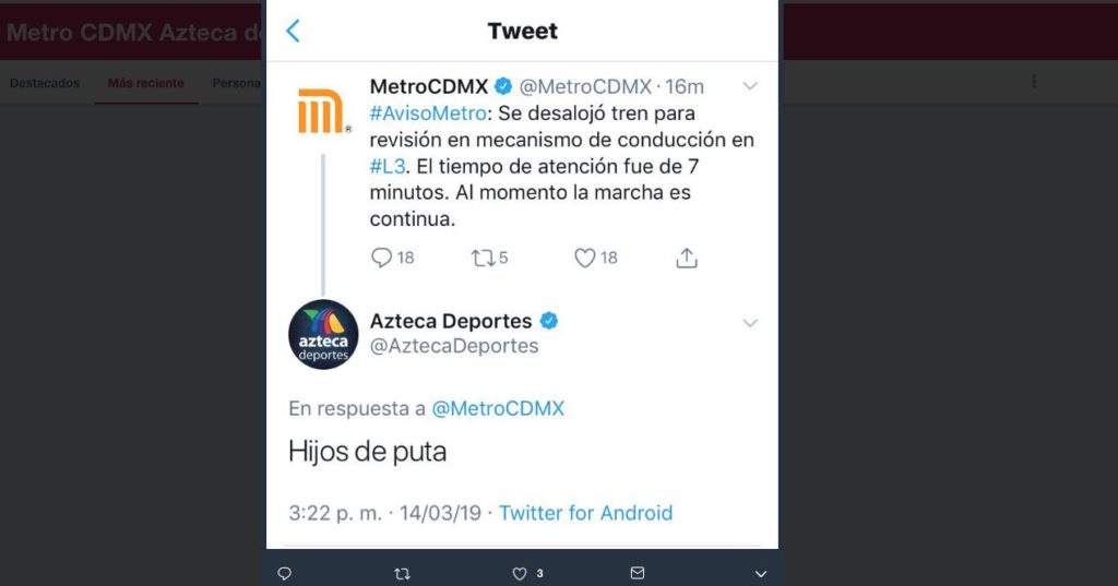 De acuerdo con reportes de diversos usuarios en redes sociales, el community manager de Azteca Deportes cometió uno de esos errores que pueden costarle caro a cualquier marca. Con una expresión fuera de cualquier canon para una empresa, el encargado del perfil de Twitter firmado por dicha empresa supuestamente respondió a una aclaración emitida por el Metro de la CDMX, luego de que se registraran algunas fallas en su servicio.