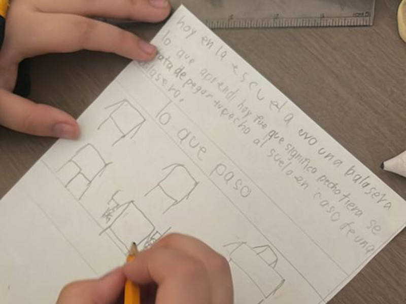 Hoy en la escuela hubo una balacera. Lo que aprendí hoy fue qué significa ‘pecho tierra’. Se trata de pegar tu pecho al suelo en caso de una balacera», se observa a un menor con uniforme escolar escribiendo en una hoja. La imagen fue compartida en su espacio de Facebook por Alberto González.