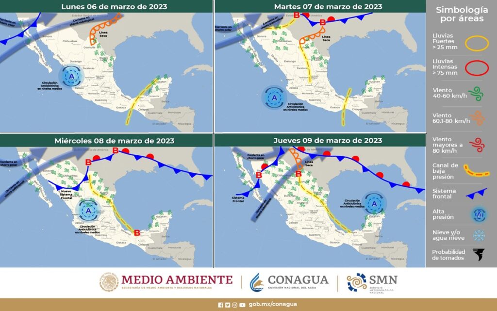 En cuanto al miércoles y jueves, en el territorio nacional dominará circulación anticiclónica en niveles medios de la atmosfera, lo que permitirá relativa estabilidad en el país; sin embargo, la disponibilidad de humedad, así como el establecimiento de canales de baja presión, favorecerán el desarrollo de nublados y tormentas aisladas vespertinas en estados del oriente y sur del país.