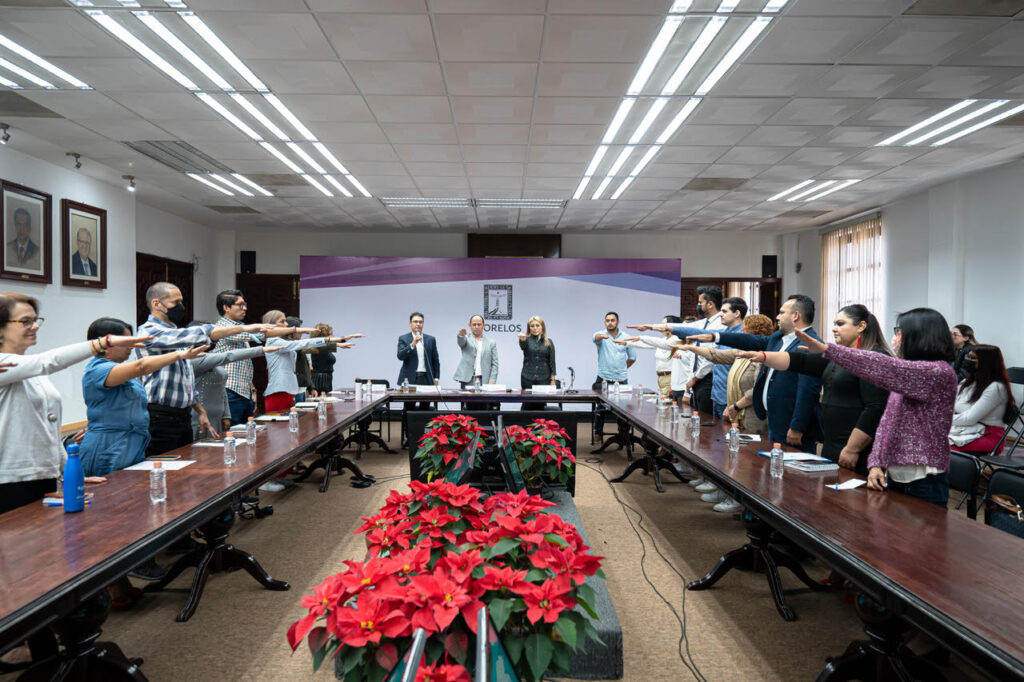 En la mesa de trabajo estuvieron Alfonso de Jesús Sotelo Martínez, secretario de Desarrollo Social; Rogelio Sánchez Pérez, director general Jurídico de la Secretaría de Gobierno; Diego Arturo Alcázar Pérez, titular del Instituto Morelense de las Personas Adolescentes y Jóvenes (Impajoven); Eleonora Izunza Gutiérrez, directora general de Promoción Cultural para la Paz y Atención a Públicos de la Secretaría de Turismo y Cultura.