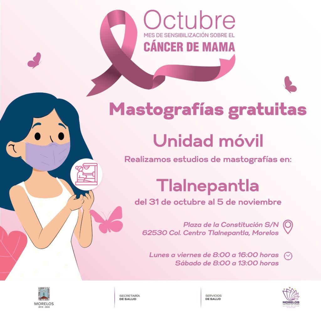 La Secretaría de Salud, a través de Servicios de Salud de Morelos (SSM), informó que se instalarán unidades móviles de citologías y mastografías en el municipio de Tlalnepantla, para detectar y prevenir el cáncer de cuello uterino y de mama.