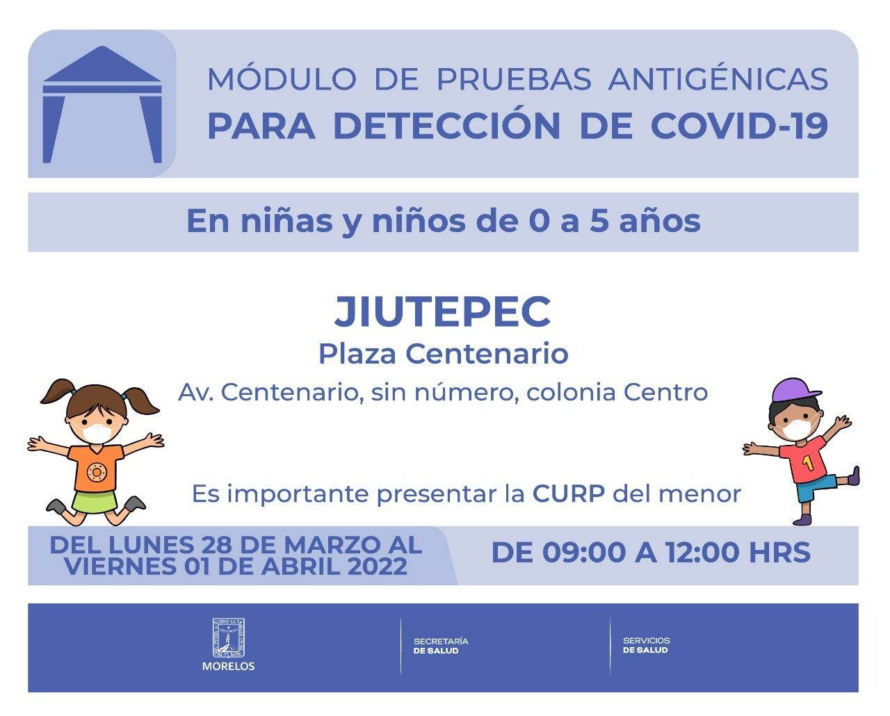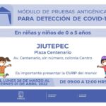 El Gobierno estatal, a través de la Secretaría de Salud y Servicios de Salud de Morelos (SSM), anunció que, del lunes 28 de marzo al viernes 01 de abril del 2022, el módulo de pruebas antigénicas para detección de COVID-19, tanto para adultos y menores de edad, estará en el municipio de Jiutepec.