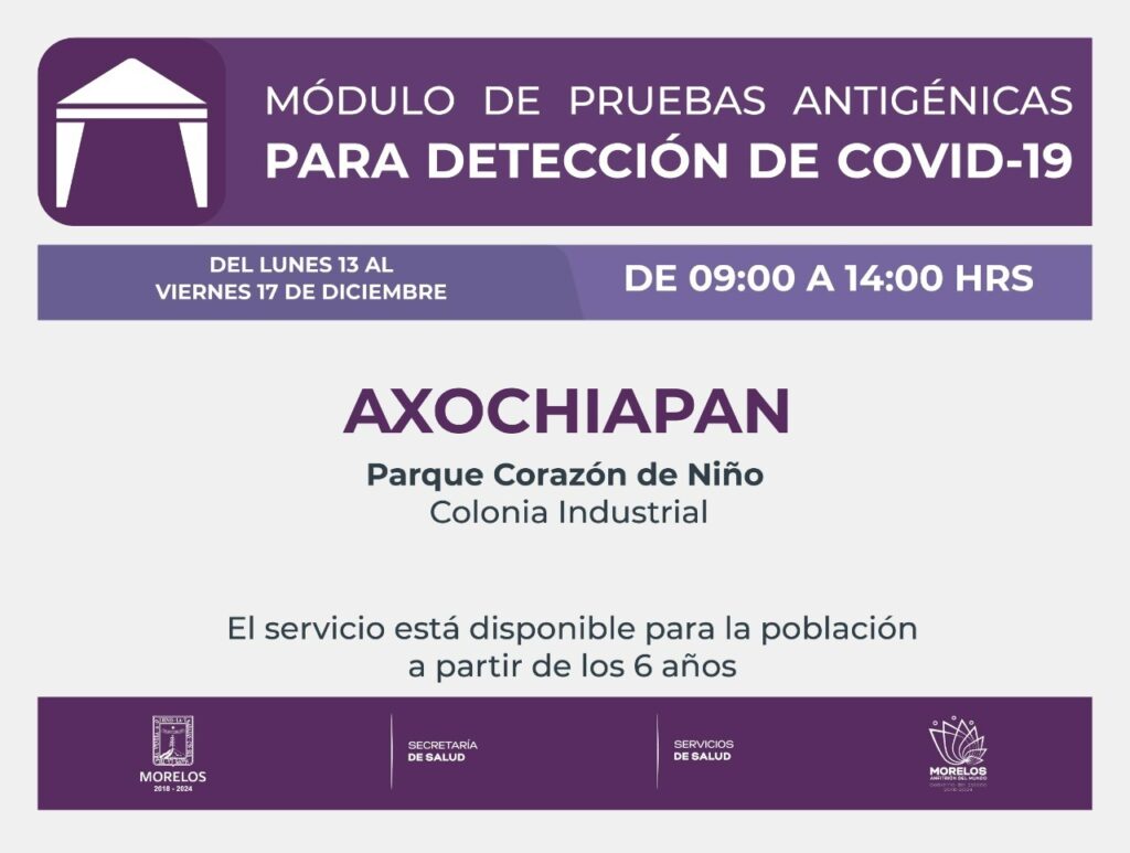 En seguimiento al plan del Fortalecimiento Estratégico de Salud para la Mitigación de Contagios de COVID-19 que mantiene el Gobierno estatal, a través de la Secretaría de Salud y Servicios de Salud de Morelos (SSM), instalarán el módulo de pruebas antigénicas en el parque “Corazón de Niño”, colonia Industrial en el municipio de Axochiapan.