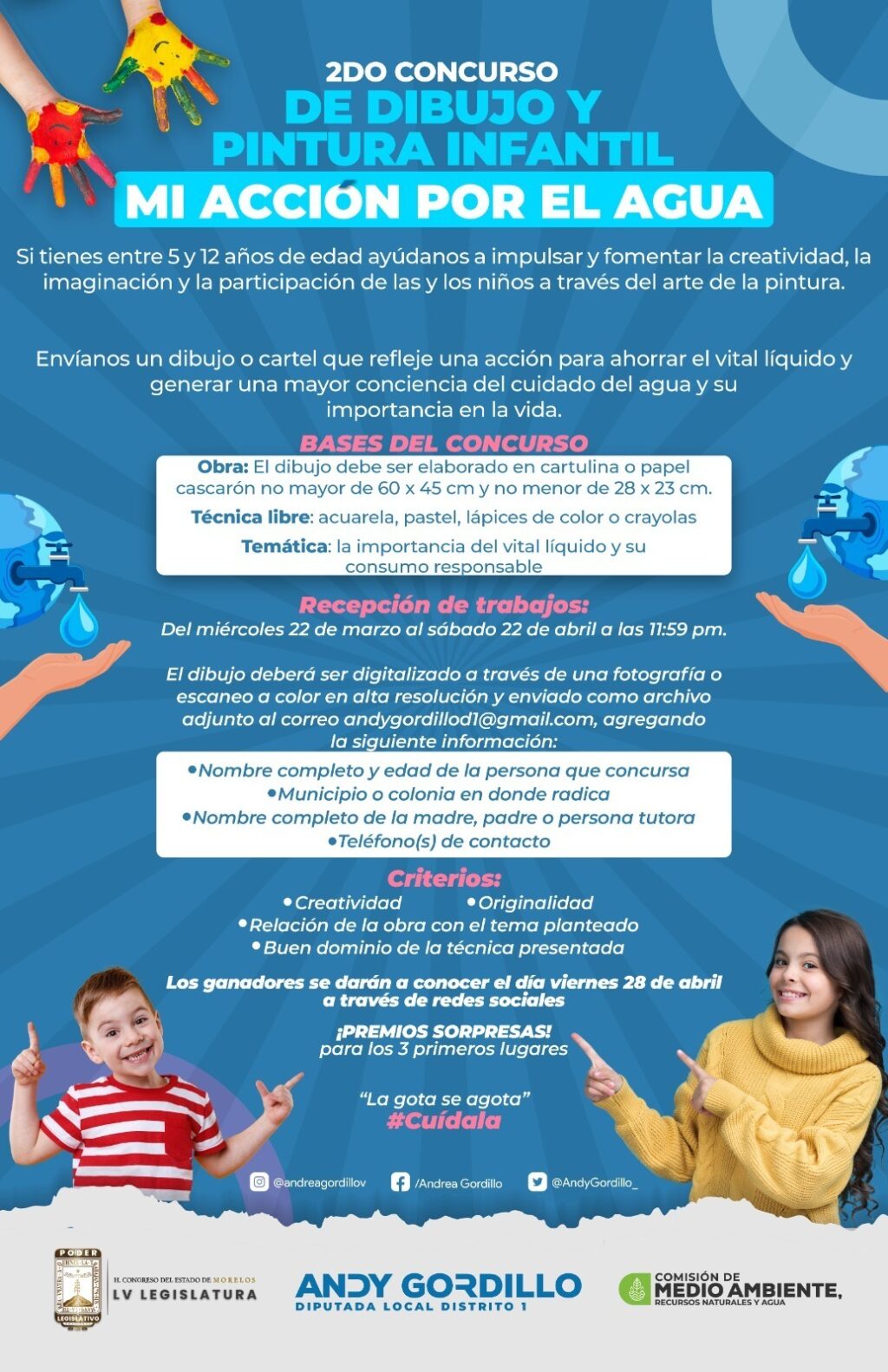 Las y los interesados en participar deberán enviar al correo: andygordillod1@gmail.com, un dibujo o cartel que refleje las acciones en pro del agua, transmitir mensajes sobre su uso racional y motivar a la ciudadanía para hacer un uso eficiente del vital líquido que asegure #MasLitrosDeAguaParaElFuturo.