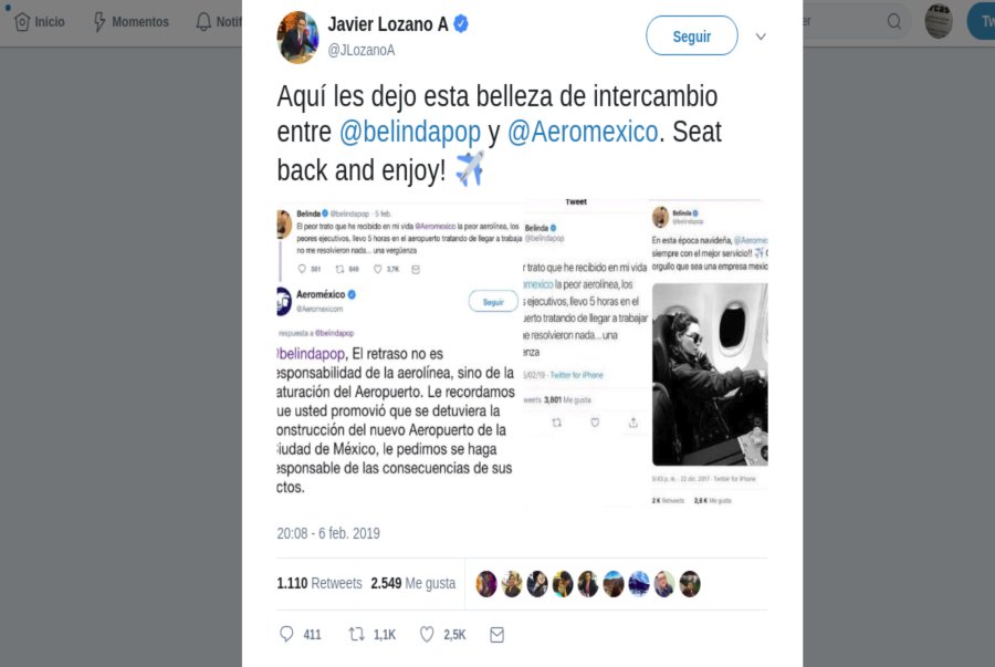 La queja realizada a principios de semana por la cantante Belinda hacia Aeroméxicopor un retraso en un vuelo revivió gracias a una publicación emitida por una cuenta falsa de la aerolínea, la cual fue impulsada, entre otros, por Javier Lozano.