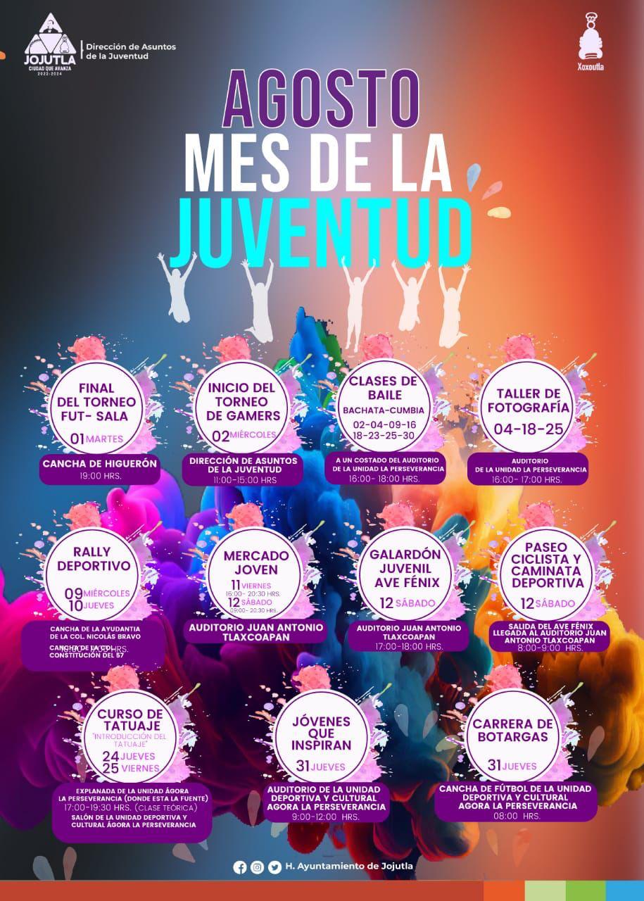 Juan Ángel Flores Bustamante, alcalde de Jojutla, a través de la dirección de Asuntos de Juventud a cargo de Bernardo Melgar Leyva, reiteró su compromiso con las juventudes, por ello, durante el mes de agosto, mes de la juventud, llevará a cabo diferentes actividades.