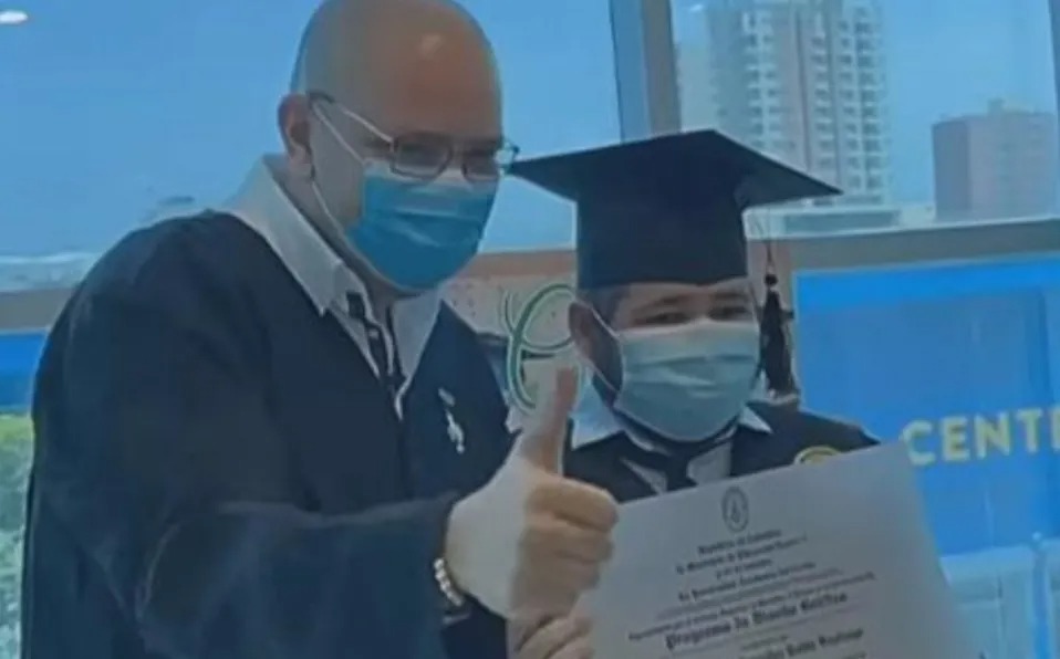 Con una toga y el diploma, el joven pudo graduarse felizmente. Además de que recibió bellas palabras en su honor.