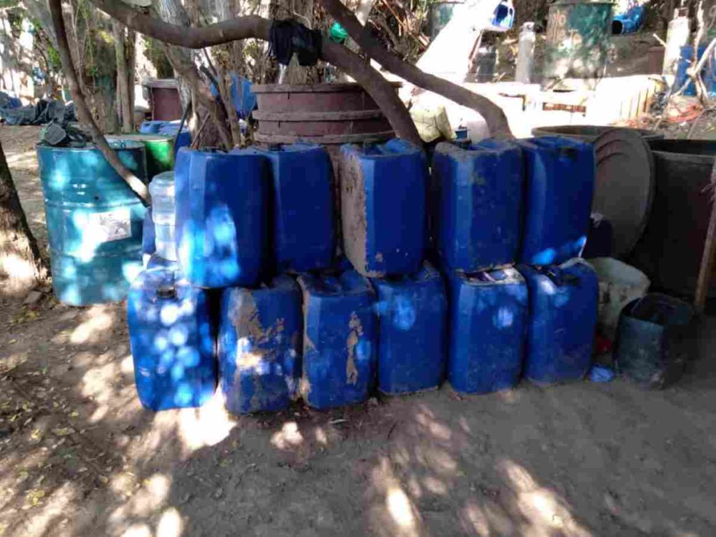 También hallaron cuatro contenedores, 13 bidones y una cubeta con capacidad de 600, 50 y 19 litros, respectivamente, con una sustancia líquida café; dos tambos y 37 bidones con capacidad de 200 y 50 litros, con una sustancia líquida incolora; tres tambos con una sustancia blanca.