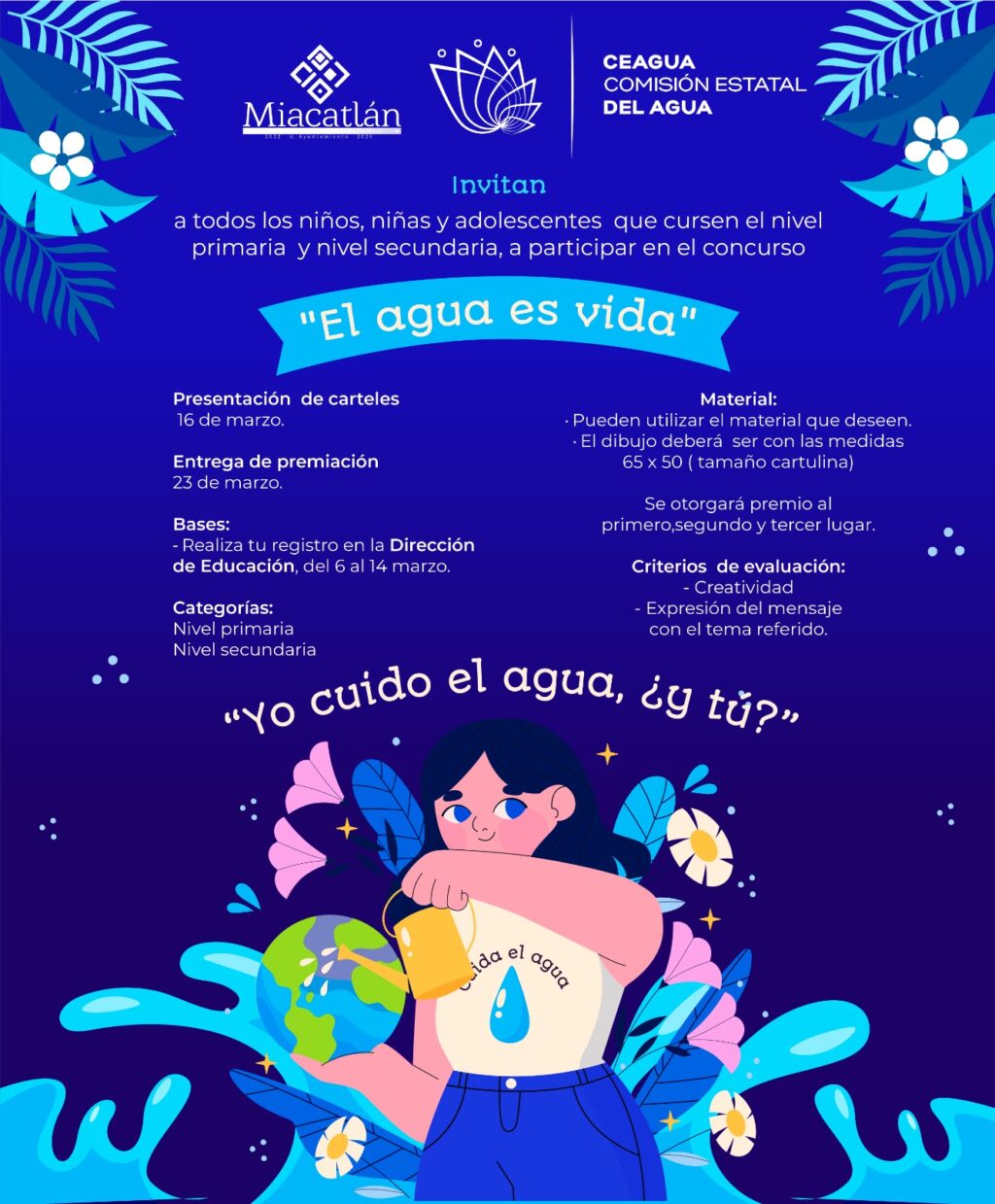 En el marco de las actividades con motivo de la celebración del Día Mundial del Agua, a celebrarse el próximo 22 de marzo, la Comisión Estatal del Agua (Ceagua) invita a niñas, niños y jóvenes de nivel básico del municipio de Miacatlán a participar en el concurso de cartel denominado “Yo cuido el agua, ¿y tú?”.