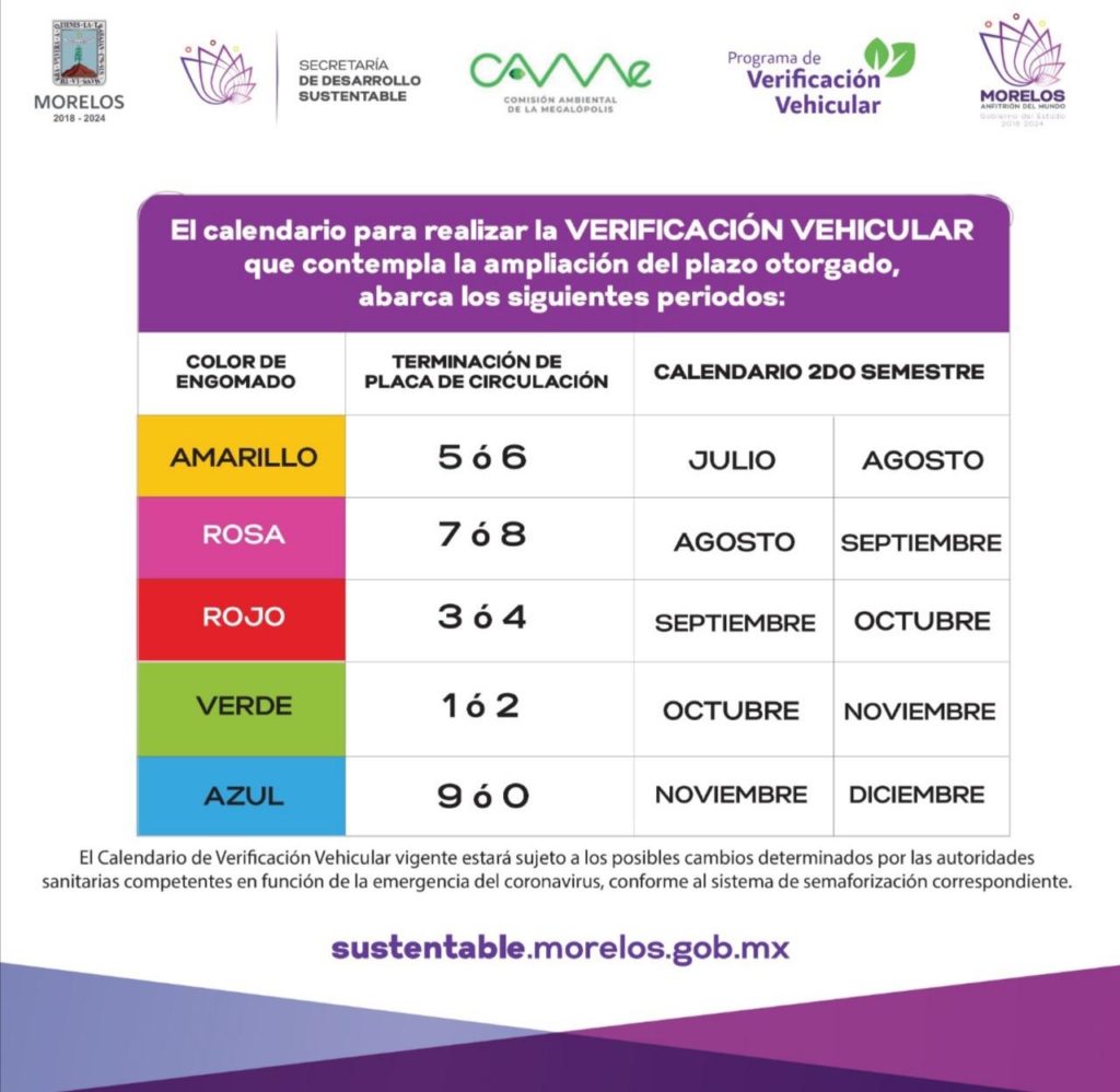 En relación a este punto, destacó que siempre y cuando tengan vigente la verificación correspondiente al segundo periodo de 2019, los engomados restantes como el rosa, rojo, verde y azul; automóviles nuevos; dados de alta en Morelos; vehículos 0, 00, cuya vigencia haya fenecido en este año, podrán circular en el Valle y Ciudad de México, sin ser multados, conforme llegue el periodo para verificar que le corresponde de acuerdo al calendario de verificación 2020 y, mientras no se venza dicho plazo.