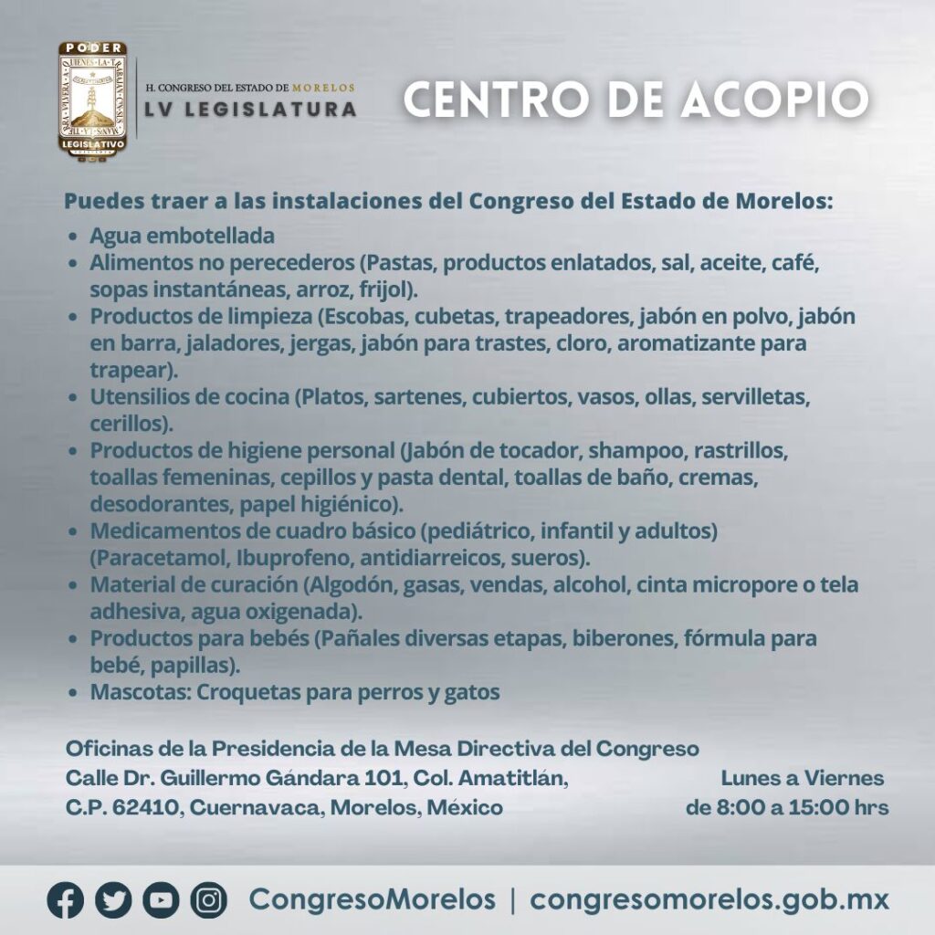 Para solidarizarnos con nuestros hermanos del vecino estado de Guerrero, afectados por el huracán “Otis”, la LV Legislatura del Congreso del estado convocó a la población de Morelos a donar víveres no perecederos y productos de primera necesidad para ser enviados a los damnificados.