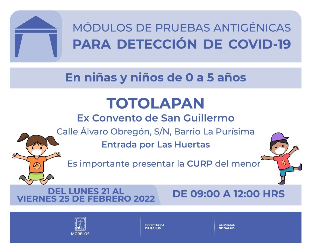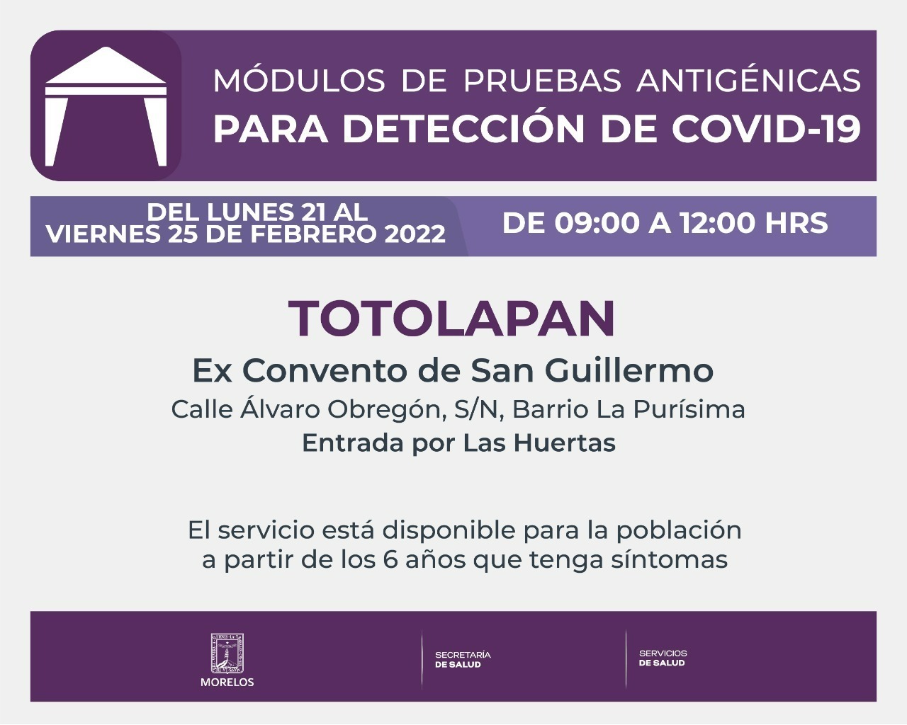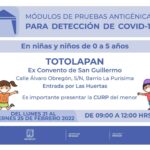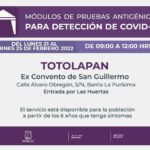 En Totolapan se instalará el módulo de pruebas de antígeno para niñas y niños de cero a cinco años; para el resto de la población estará ubicado en el ex Convento de San Guillermo, calle Álvaro Obregón, sin número, Barrio La Purísima, entrada por Las Huertas.