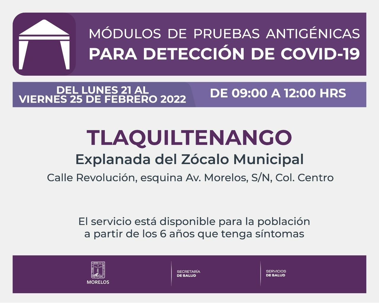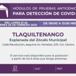 Del lunes 21 al viernes 25 de febrero del año en curso, Servicios de Salud de Morelos (SSM) instalará módulos de pruebas antigénicas para la detección de COVID-19 en Tlaquiltenango, Totolapan y Coatlán del Río.
