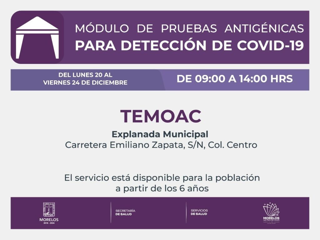 Del 20 al 24 de diciembre, el Gobierno estatal, a través de la Secretaría de Salud y Servicios de Salud de Morelos (SSM), ubicará el módulo de pruebas antigénicas en la explanada municipal de Temoac.