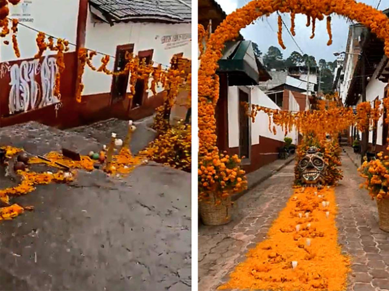 En un video que circula en redes sociales se aprecia el momento en que el agua arrastra con las flores de cempasúchil colocadas en la calle Abasolo, mejor conocida como «La calle de los escalones», donde fue montado el altar.