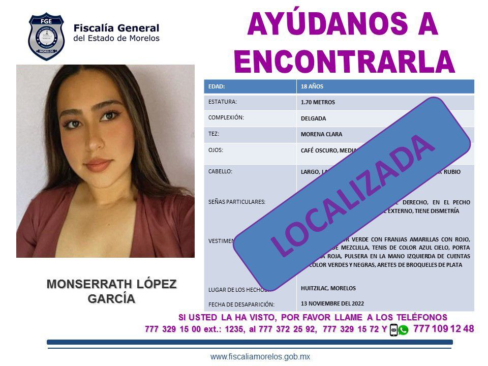 La Fiscalía General del Estado de Morelos informa la localización con bien de Montserrath “N” de 18 años de edad, quien compareció este domingo 21 de noviembre de manera voluntaria ante el Ministerio Público de la Fiscalía General de Justicia de la Ciudad de México.