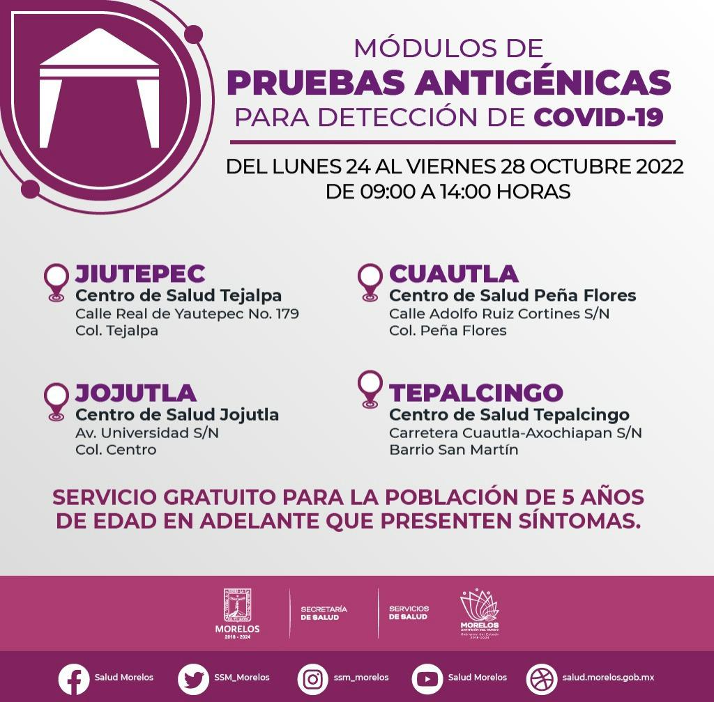 La Secretaría de Salud, a través de Servicios de Salud de Morelos (SSM), mantiene al alcance de la población las pruebas antigénicas en los centros de salud, para detectar casos positivos a COVID-19.
