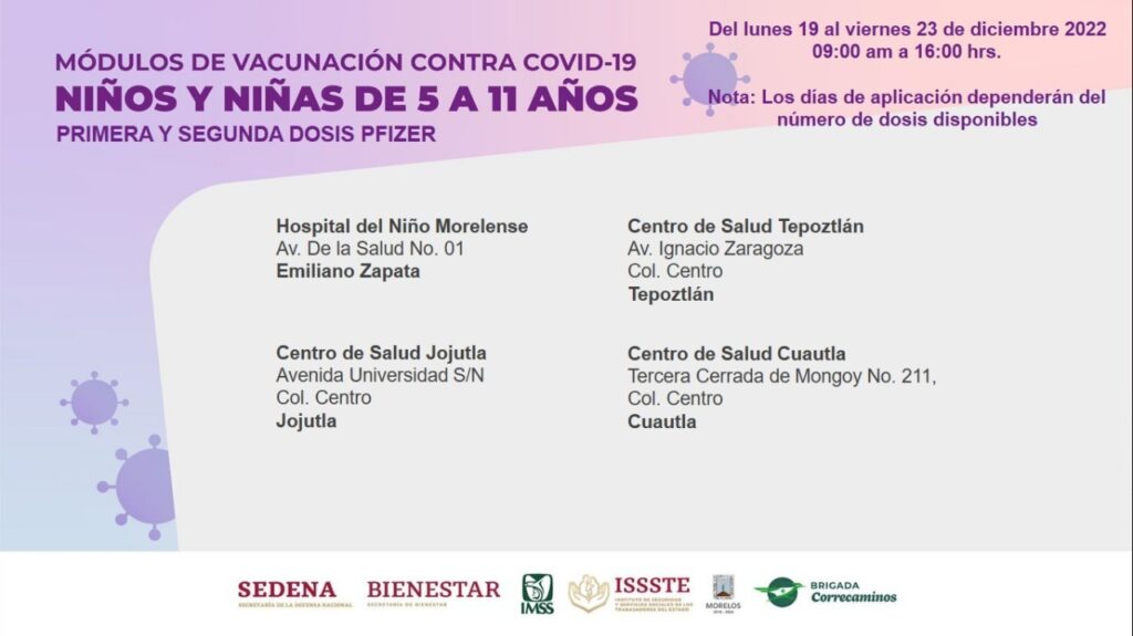 Autoridades federales y estatales mantienen la jornada de vacunación contra COVID-19 a niñas y niños de 5 a 11 años de edad, del lunes 19 al viernes 23 de diciembre del 2022, en un horario de 09:00 a 16:00 horas.