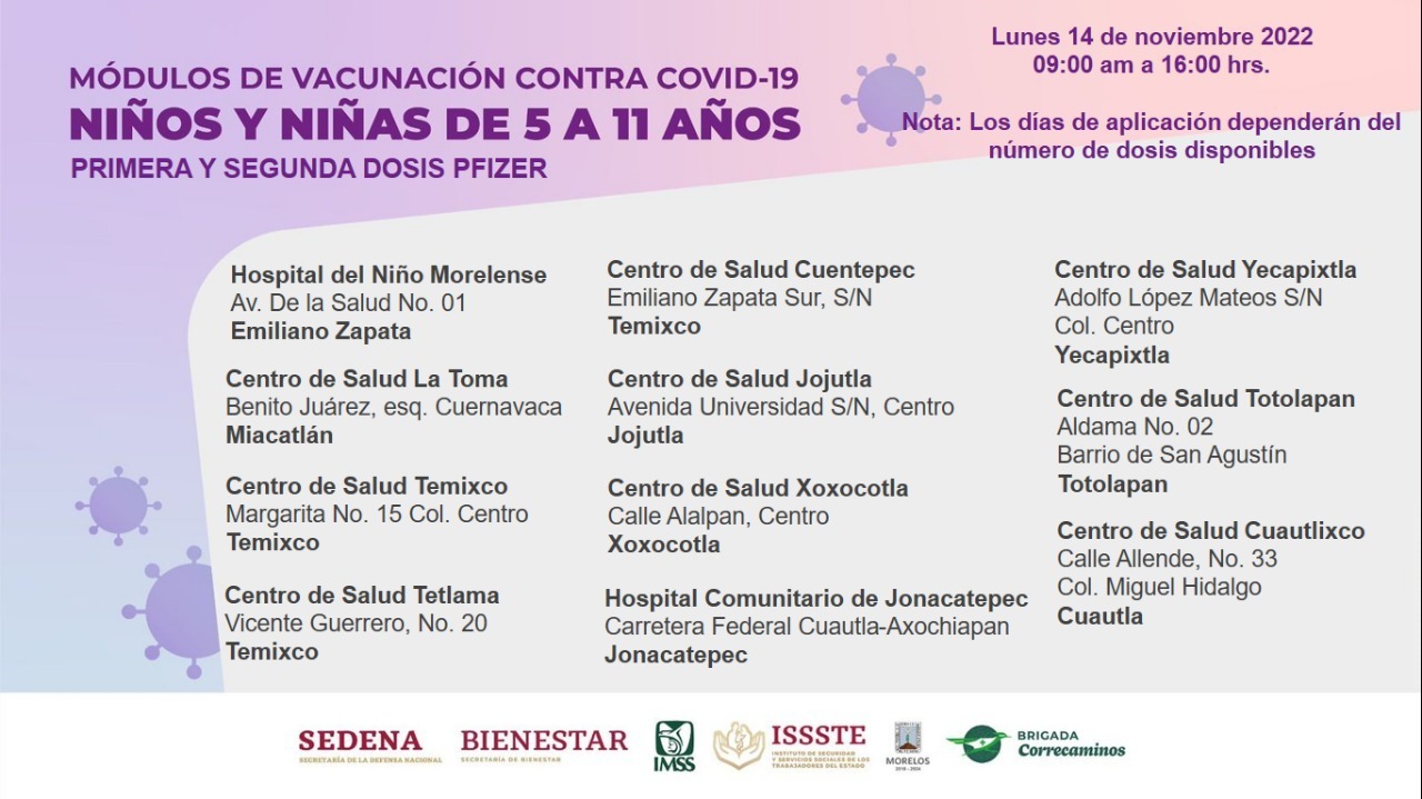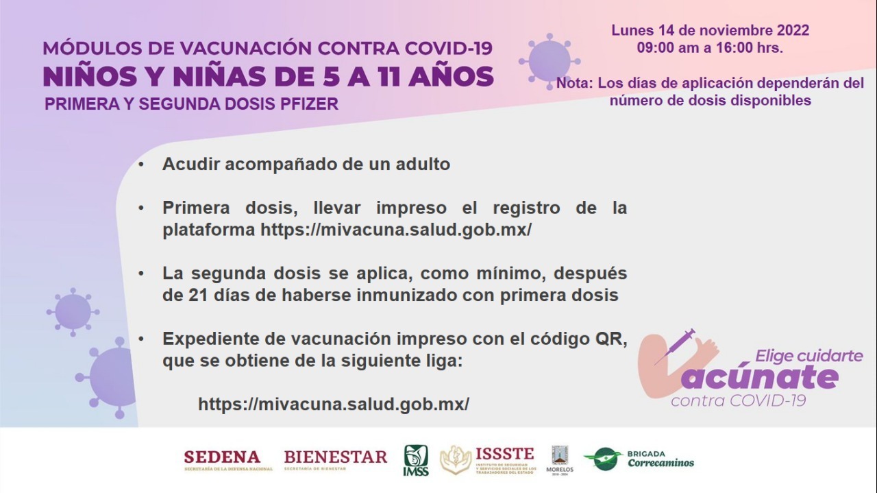 Con el objetivo de ampliar la cobertura de vacunación contra COVID-19, autoridades federales y estatales informaron que se mantiene la inmunización a niñas y niños de 5 a 11 años de edad, en los puntos activos el 14 de noviembre de 2022, en un horario de 09:00 a 16:00 horas.